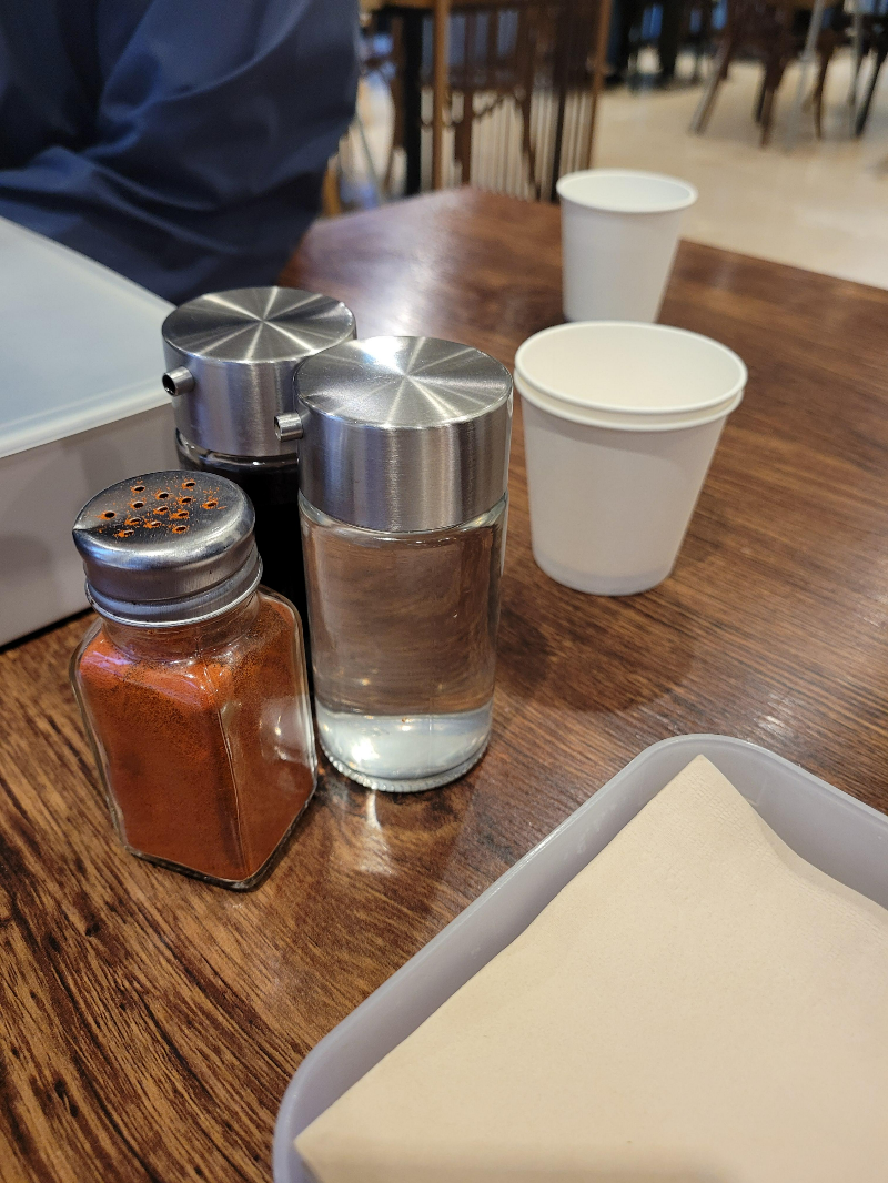 테이블 위에는 식기 외에도, 식초, 간장, 고춧가루 등 음식과 곁들여먹을 수 있는 각종 양념이 준비되어 있어요.