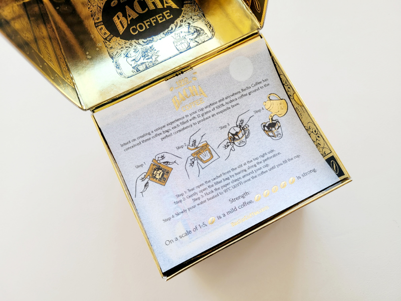 When you open the box, you’ll find a flashy gold wrapping, along with instructions for using the drip bags. Normally, I’d pour water at about 80°C for a smoother taste, but the instructions actually recommend using water at a higher temperature of around 95°C. Of course, the water temperature can be adjusted based on personal preference.