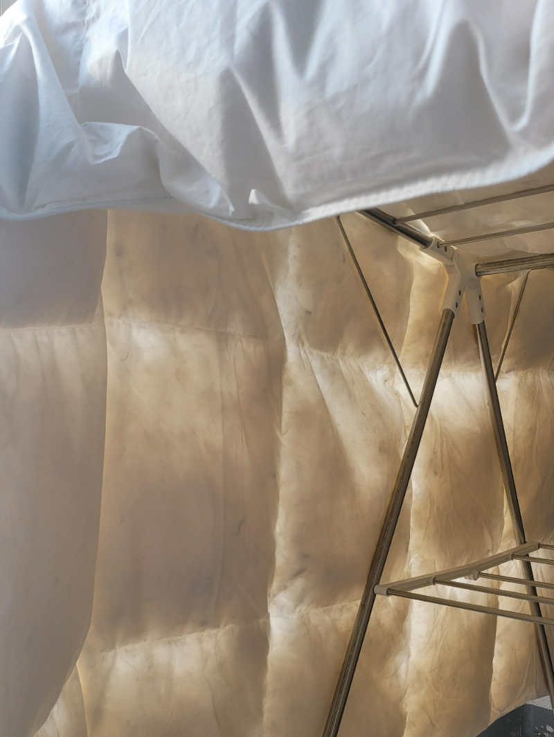 I made sure to give it plenty of sunlight until the cover arrives. Since it’s 90% small feathers, I noticed a few black feathers showing through. I was torn between a four-season duvet and a mid-season duvet, but I’m glad I chose the latter.