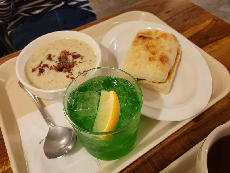 친구는 뉴잉글랜드 클램 차우더와 베이컨 가지 샌드위치를 주문했어요.