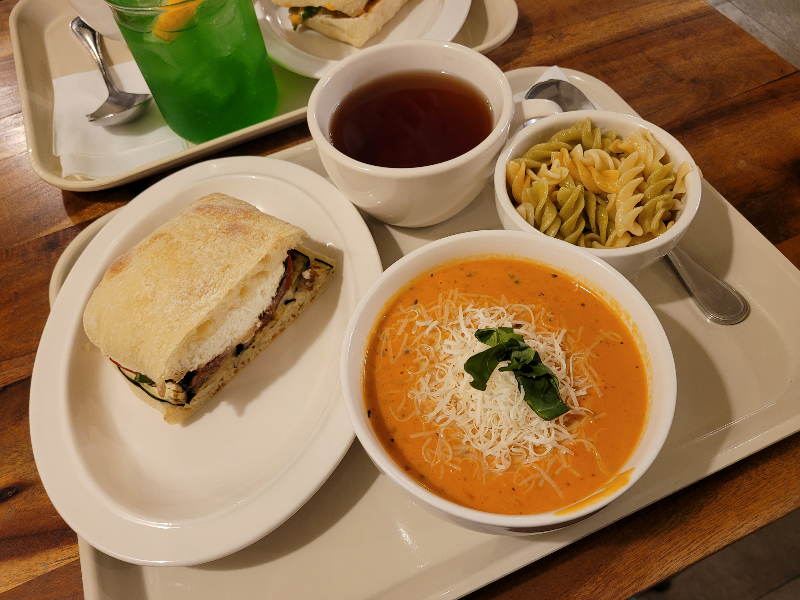 저는 토마토 바질 크림 수프와, 그릴드 베지 & 리코타 샌드위치를 주문했어요. 파스타면도 추가해보았습니다.