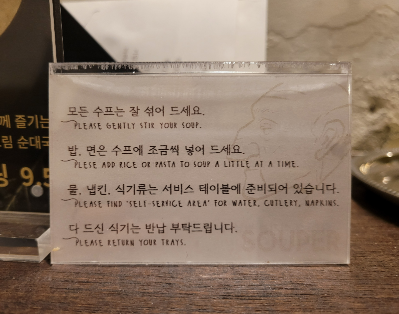 테이블 위에는 수프 먹는 방법이 간단하게 적혀있어요.