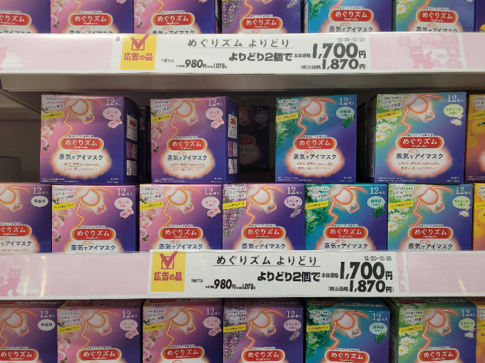 메구리즘 온열 안대도 할인에 면세까지 받으면 개당 810엔 정도라 2개 샀어요.