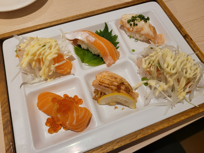 첫번째는 연어 모듬 초밥. 연어를 다양하게 활용한 6종류의 초밥이 나왔는데요, 사진에 보이는 소스는 마요네즈가 아니라 치즈가 들어간 소스라 독특했어요.