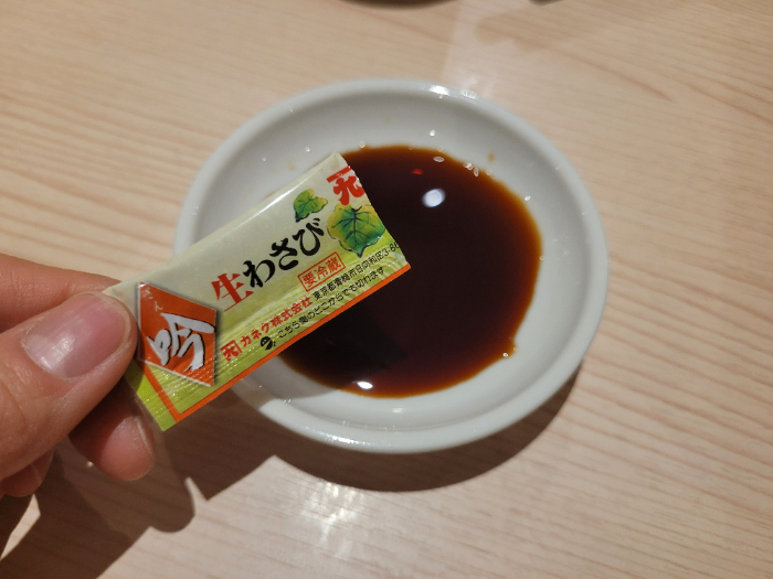 간장은 2종류가 있었고, 와사비도 테이블에 소포장된 게 비치되어있어서 하나씩 짜서 이용할 수 있어요.