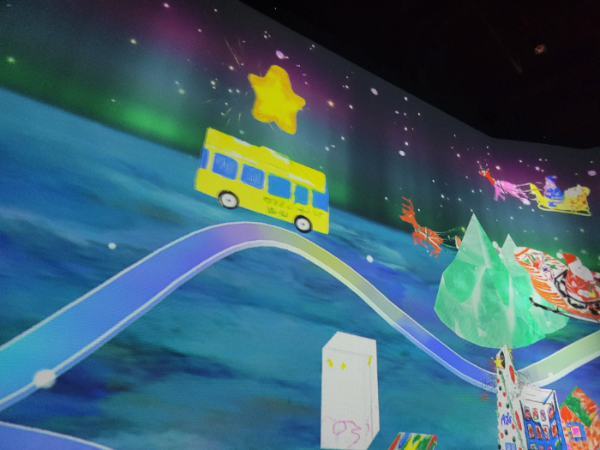 색칠한 도안을 직원분이 스캔해 주시면, 바닥에서 그림이 나타나요. 바닥과 벽을 타고 아이들이 그린 그림이 패턴처럼 움직이는데, 정말 예쁘고 신기합니다.