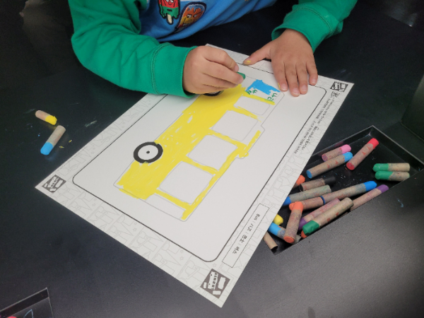 탈 것들을 색칠할 수 있는 공간도 있는데요, 아이는 스쿨버스를 그리더라고요. 종이와 오일 파스텔 퀄리티가 좋아서 색칠이 엄청 부드럽게 잘 돼요.