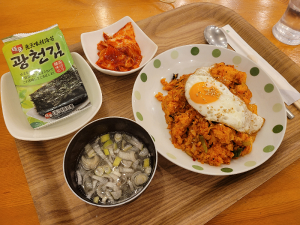 김치볶음밥에 스프(장국), 김치, 김이 포함되어있고, 맛은 분식집에서 파는 맛과 비슷했어요. 김치가 맛있어서 잘 먹었네요 :)
