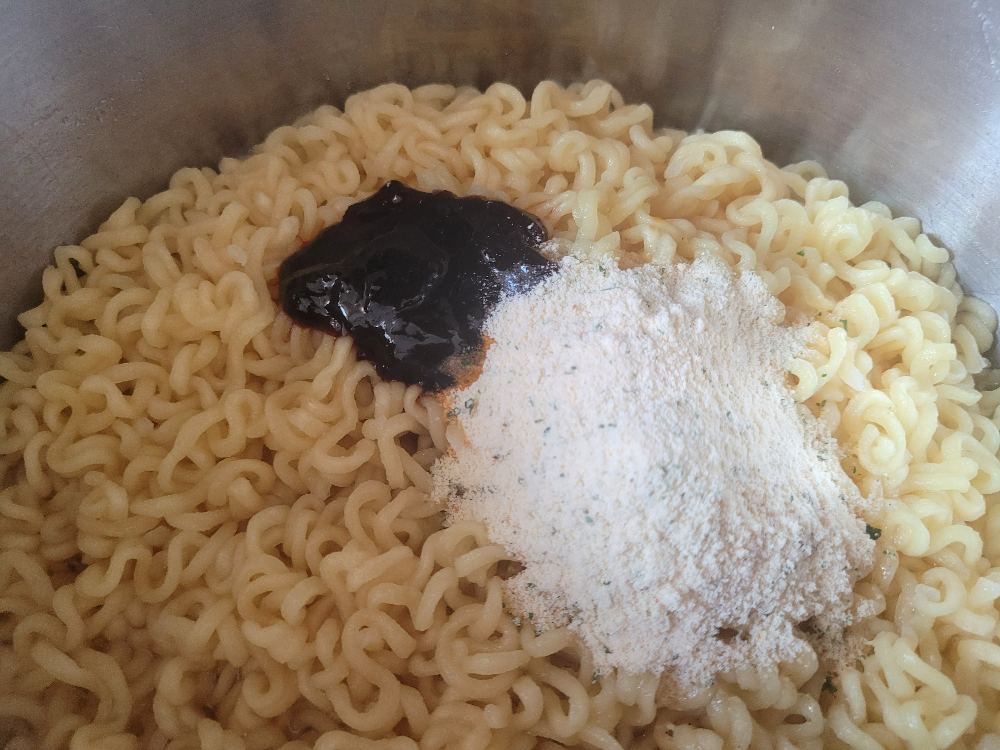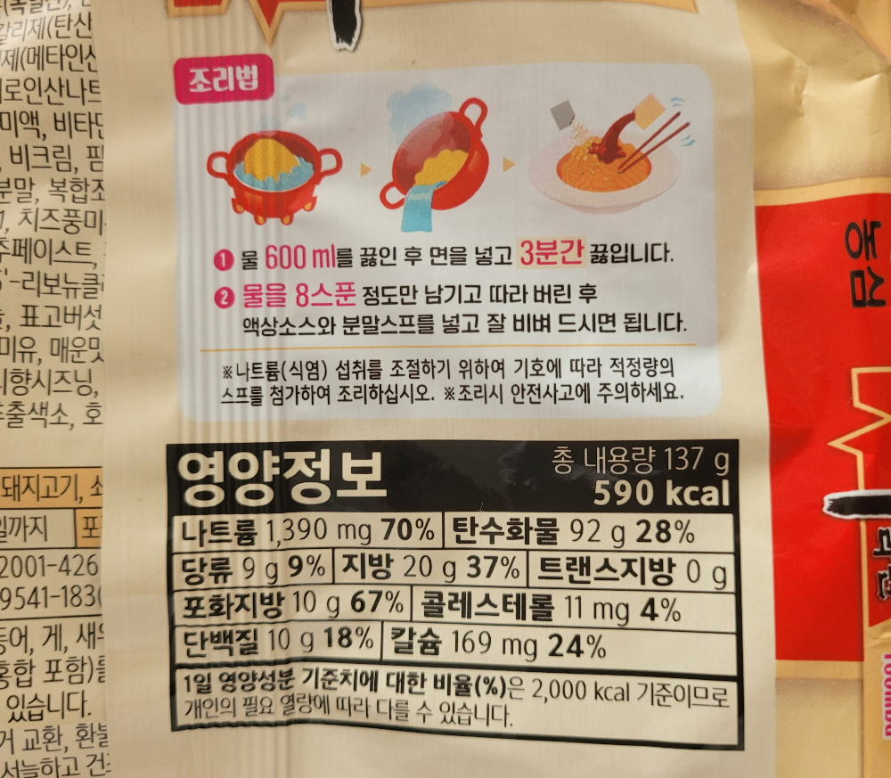 내용물을 살펴보니 면과 분말스프, 액상소스로 구성되어 있어요. 조리법은 짜파게티랑 비슷해요. 물을 끓인 후, 면을 넣고 약 3분간 익힌 후 물을 8스푼 정도 남기고 버려줍니다. 그리고 분말스프와 액상소스를 넣고 비벼주면 되는데요.