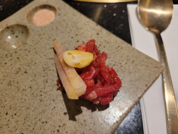 The yukhoe (beef tartare) was served first, before the meat hit the grill.