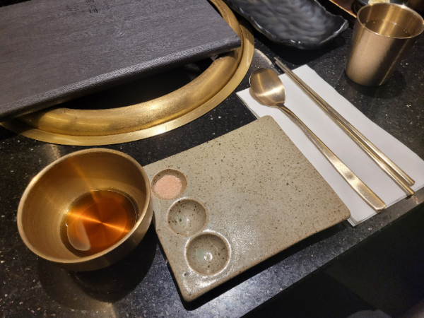 고기는 개인 플레이트에 올려 먹을 수 있고, 취향에 따라 와인 솔트에 찍어먹거나 간장소스와 곁들여먹으면 됩니다.
