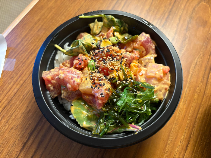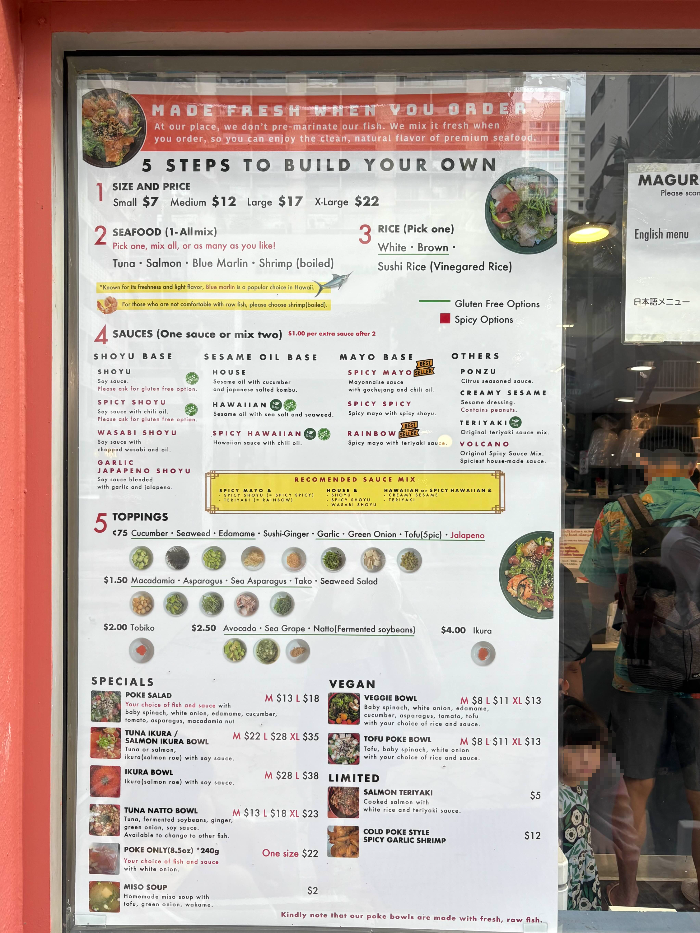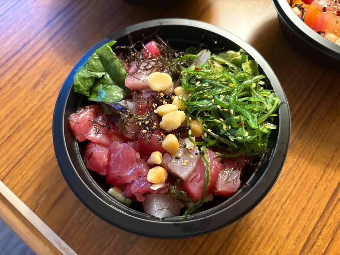 마구로 스팟은 와이키키 비치에서 가성비 좋은 포케집으로 유명해요. 갈 때마다 줄이 늘어서 있지만 회전율이 좋아서 많이 기다리지 않아도 되더라고요. 매장 앞에 테이블이 몇 개 있지만 저희는 포장해서 호텔방에서 편하게 먹기로 했어요.