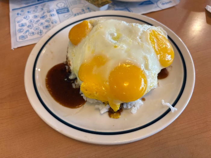 하와이 전통 음식인 로코모코도 아이홉 스타일이 궁금해 주문해 보았는데요, 밥 위에 소고기 패티와 계란 프라이, 그리고 그레이비 소스가 올려져 있었어요. 다만 야채가 없다보니 느끼해서 결국 스테이크 소스 더 찹찹 뿌려먹었어요.