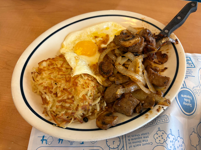 Sirloin Tips & Eggs는 설로인 스테이크와 양파, 버섯이 조화롭게 어우러져 있었고, 감자전 느낌의 해시브라운과 계란이 사이드로 함께 나와 양과 맛 모두 만족스러웠어요.