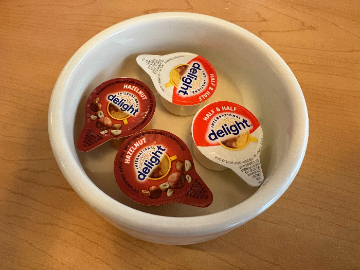 테이블에는 작은 미니 사이즈의 프림(커피 크리머)과 설탕, 인공 감미료 등이 함께 비치되어 있어서 원하는 대로 커스터마이징해서 마실 수 있어요.