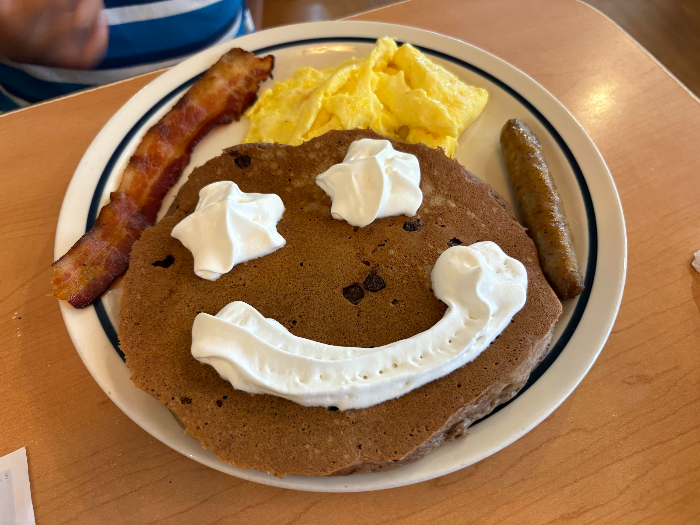 아이는 Happy Face Pancake라는 귀여운 얼굴 모양 팬케이크가 포함된 키즈 메뉴를 주문했어요. 팬케이크는 초코칩으로 선택했고, 스크램블 에그와 베이컨, 그리고 초코우유($3.99)를 곁들였답니다. 특히 팬케이크 위에 생크림으로 그려진 스마일이 너무 귀여워서 아이도 무척 좋아했어요.