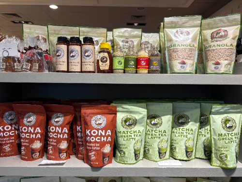 매장 한쪽에는 하와이 특산품과 굿즈를 판매하는 공간도 마련되어 있어서, 주문한 음식을 기다리는 동안 구경하는 재미도 쏠쏠했어요. 커피 원두(100% Kona Coffee 포함), 그래놀라, 꿀, 굿즈 등이 있고 여행 기념품을 찾는 분들께도 추천하고 싶은 곳이에요.