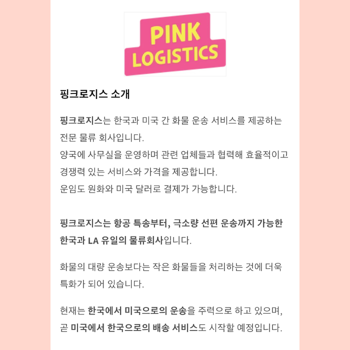 최근 미국에 있는 가족에게 물건을 보낼 일이 생겨, 이번에는 핑크 로지스틱스라는 업체를 이용해보았어요. 후기가 없어서 보내면서 살짝 불안하긴 했으나, 배송은 빠르고 안전하게 잘 도착하여 후기 남겨봅니다.
