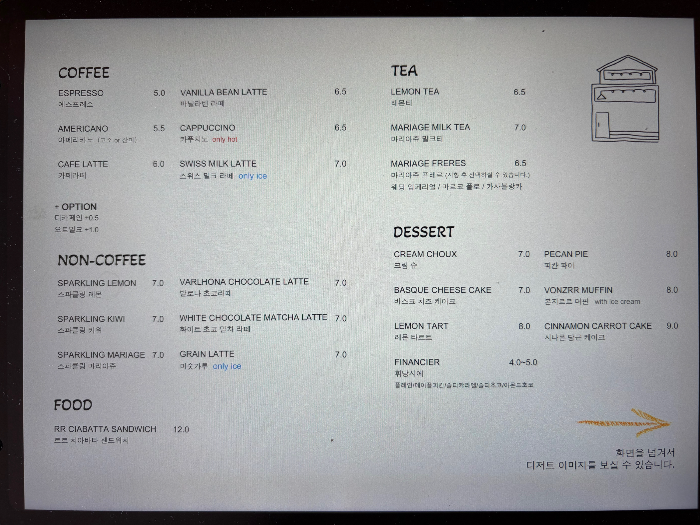 자리를 먼저 잡은 후, 주문과 결제는 카운터에서 진행했어요. 제가 주문한 메뉴는 바닐라빈 라떼, 미숫가루, 바스크 치즈케이크, 르르 치아바타 샌드위치였어요.