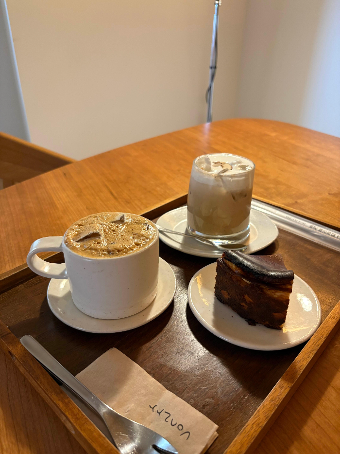 주문한 음식과 음료는 트레이에 한 번에 담겨 나왔어요. 바닐라빈 라떼, 미숫가루, 바스크 치즈케이크가 깔끔하게 세팅되어 있어서 사진 찍기에도 좋았답니다.