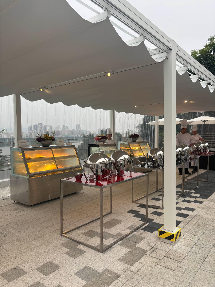 비가 많이 오면 세미뷔페가 취소될 수 있어 걱정이 되었는데… 다행히 폭우는 오지 않았고, 흐린 하늘에 보슬보슬 가볍게 내리는 비 덕분에 오히려 풀사이드 조명과 맞물려 아늑하고 운치 있는 여름밤 감성을 느낄 수 있었어요.