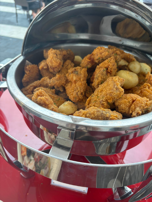 A variety of hot dishes were prepared, including LA galbi, roast beef, chili shrimp, sausages, skewers, and fried rice, so everyone could enjoy according to their taste. The ingredients and cooking were of good quality, making the overall experience very satisfying.