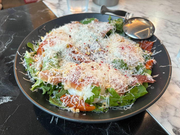 하몽 수란 샐러드는 짭조름한 하몽과 고소한 수란이 어우러져 담백하고 신선했어요.