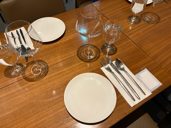 테이블은 깔끔하게 세팅되어 있었고, 와인잔도 함께 준비되어 있어 식사와 와인을 함께 즐기기 좋은 분위기였어요.