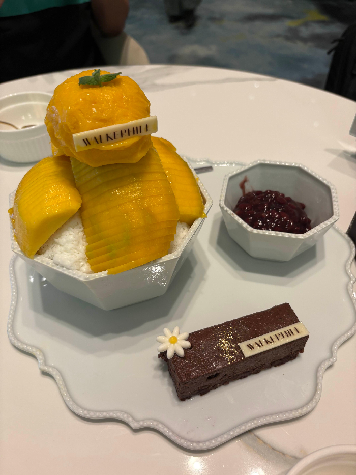 Alongside the bingsu, we were also served a slice of chocolate mousse cake with the Walkerhill logo on top. Its smooth, rich chocolate flavor paired perfectly with the sweet and tangy mango bingsu, making for a delightful dessert combo. Sweet red beans were also served separately, so you could enjoy them according to your taste.