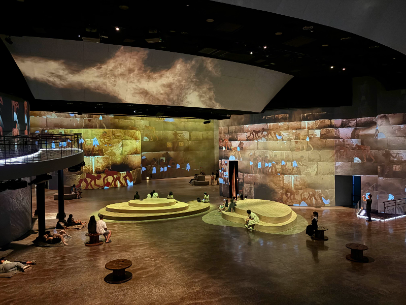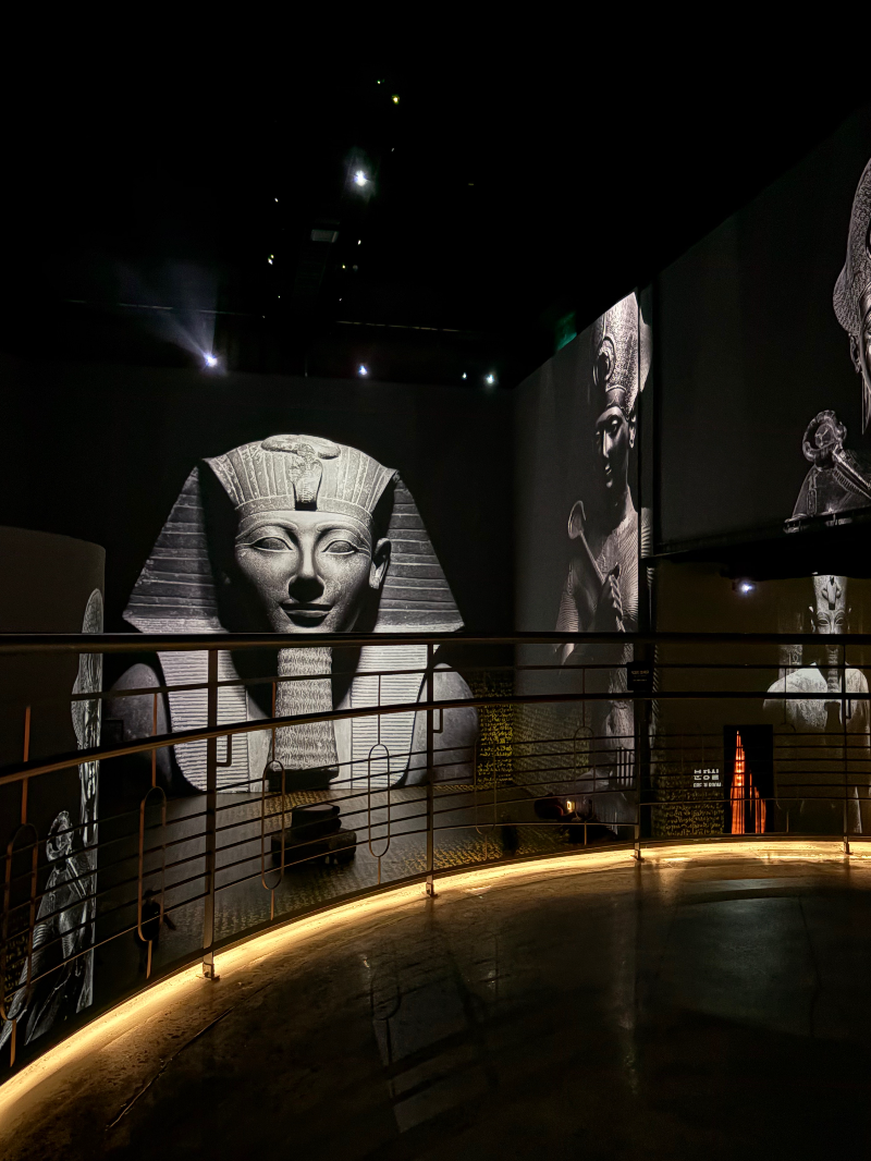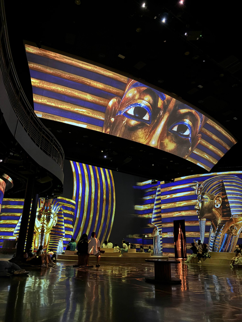 메인 상영관의 하이라이트는 골드와 울트라마린으로 화려하게 표현된 파라오의 모습이었는데, 그 압도적인 비주얼에 감탄을 금할 수 없었어요. 영상과 빛의 연출 덕분에, 마치 실제로 고대 이집트를 여행하는 듯한 몰입감을 느낄 수 있었답니다.