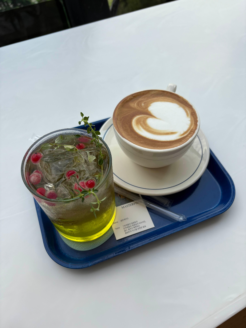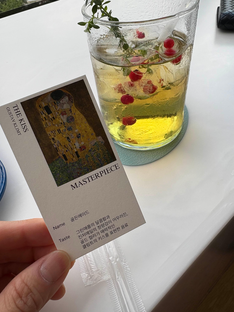 전시 관람 후에는 ‘빛의 라운지’에 들러 커피 한 잔하며 여유를 즐겼어요. 빛의 시어터 관람객은 음료와 케이크를 10% 할인된 가격에 이용할 수 있어요. 클림트의 '키스' 작품에서 영감을 받은 음료도 있어서 컨셉이 재밌더라고요.