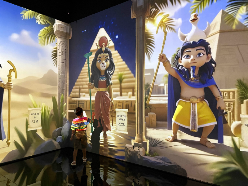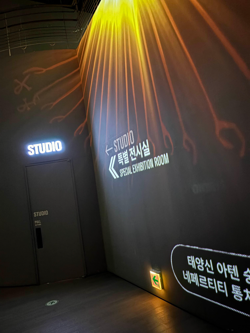 STUDIO의 특별 전시실은 인터랙티브 전시로 운영되고 있었어요. 전시 속에서는 이집트의 다양한 숭배신이 캐릭터화되어 있어, 터치하면 반응하는 모습을 볼 수 있더라고요. 아이들이 직접 만지고 반응을 확인하며 즐길 수 있어 특히 좋아했어요.