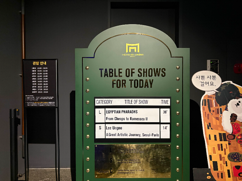 점심 식사를 마친 후, 워커힐 호텔 내 빛의 시어터 Théâtre des Lumières로 향했어요. 이번 전시는 ‘빛으로 깨어난 고대 문명, 파라오의 이집트’라는 주제로, 고대 이집트 문명을 몰입형 미디어 아트로 생생하게 체험할 수 있었어요.