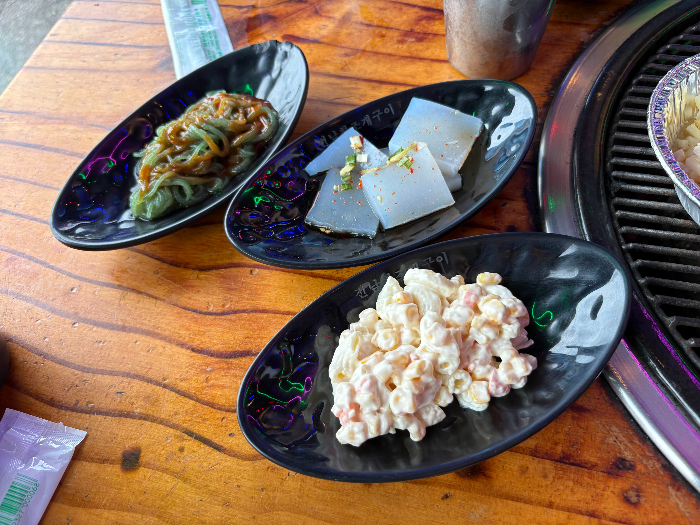 저희는 조개구이 3인분을 먼저 주문했어요. 주문하자마자 샐러드 반찬류 세 가지(곤약면 샐러드, 청포묵 샐러드, 콘샐러드)가 먼저 세팅되었어요. 조개가 구워지기 전 간단히 입맛을 돋우기 딱 좋았답니다.