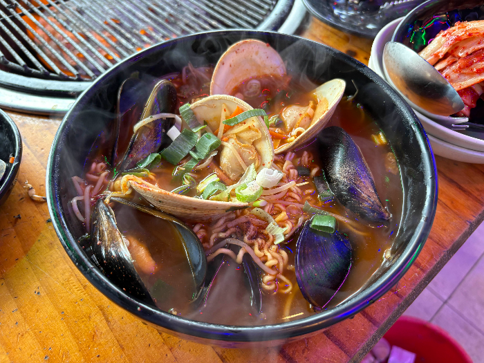 After finishing the clams, we ordered seafood ramen. It was loaded with mussels, clams, squid, and other seafood, and paired perfectly with the kimchi that came as a side.
