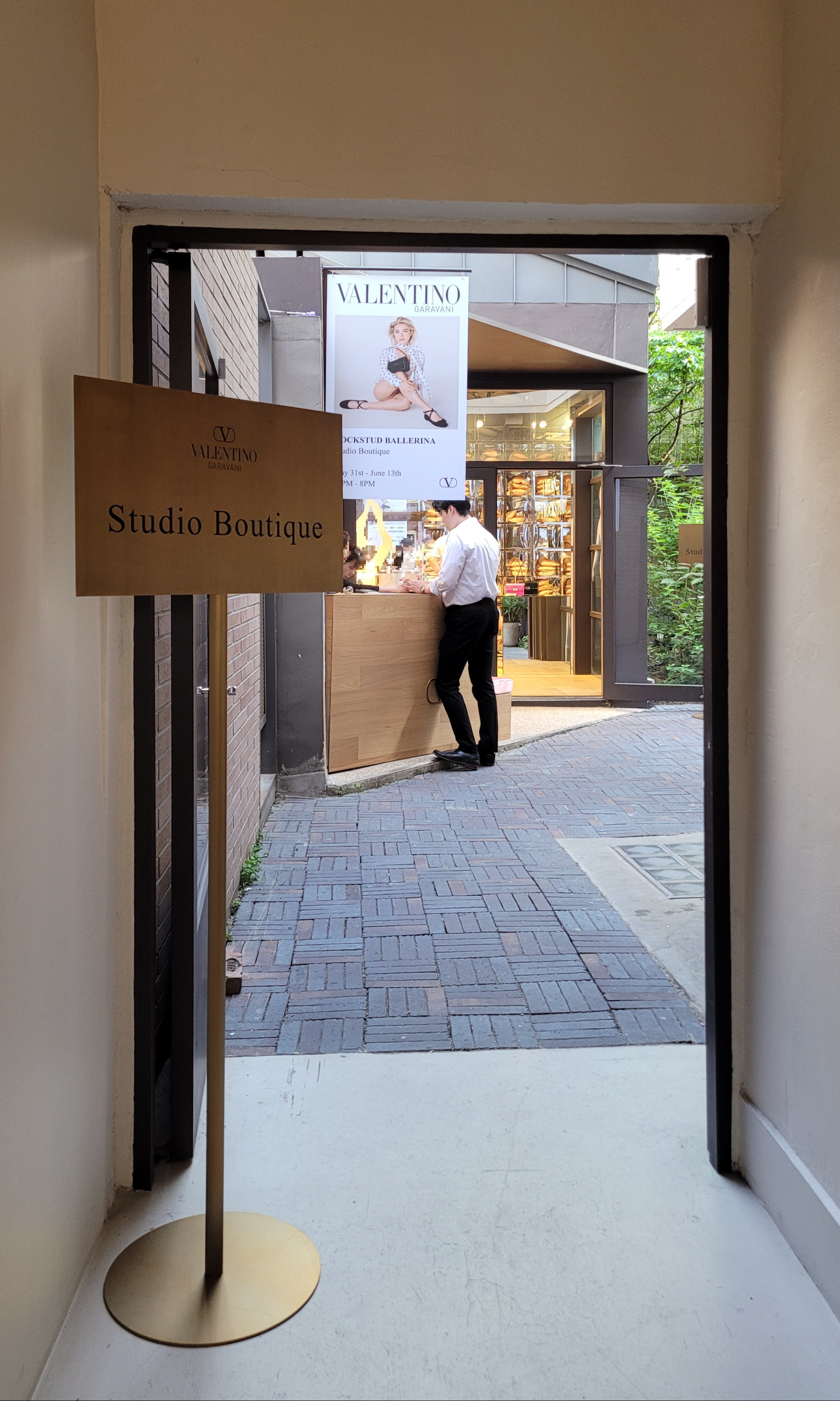 입구 왼쪽에 서 계신, 흰셔츠를 입은 남자 직원 분께 스튜디오 부티크에 방문했다고 말씀드리면 입장할 수 있어요.