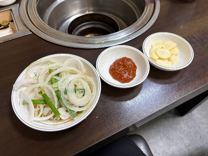 주문하고 나니 고기와 함께 먹을 양파 슬라이스, 마늘, 쌈장, 쌈채소가 먼저 나왔어요.