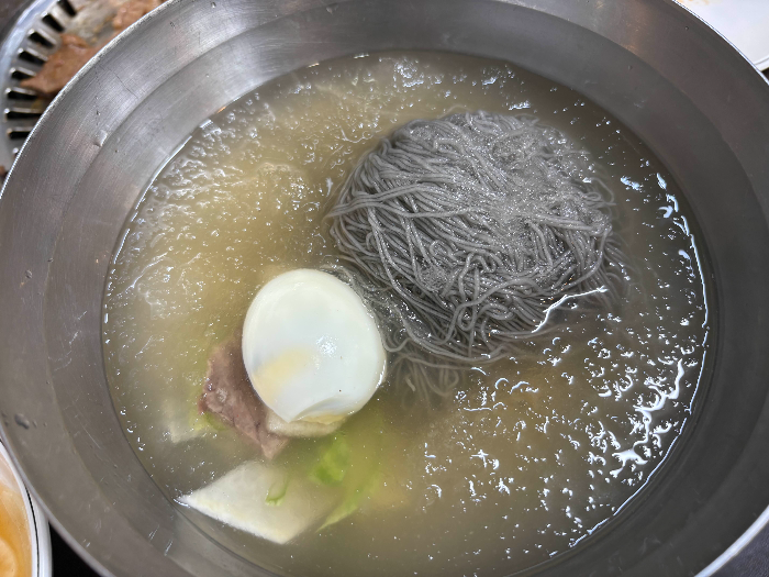 Towards the end, I usually grab cold noodles (naengmyeon). The slightly tangy, mildly sweet broth pairs perfectly with the meat.