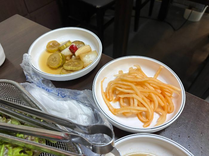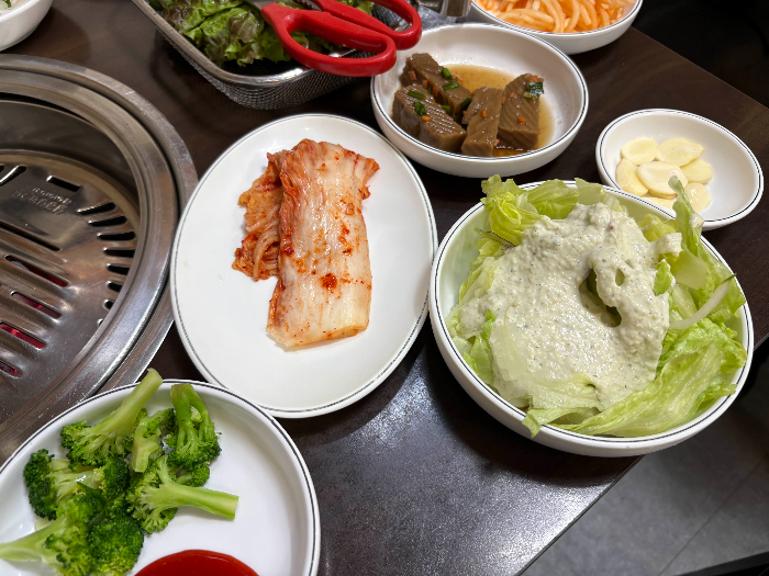 밑반찬으로는 김치, 양상추 샐러드, 도토리묵 무침, 무생채, 피클, 데친 브로콜리, 가자미식해 등 다양하게 준비되어 있었습니다. 저는 가자미식해가 특히 맛있더라고요. 고기와 함께 먹으면 맛의 조화가 좋아 한 상 가득 차려진 느낌으로 즐길 수 있습니다.