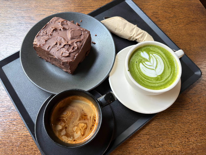 I tried a Vanilla Bean Latte, Matcha Latte, and a slice of Triple Chocolate Cake.