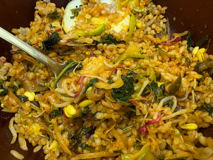 The stir-fried octopus was slightly spicy with a hint of sweetness, and the chewy octopus paired beautifully with crisp vegetables. Mixed together with the barley rice, it created a wonderful balance of flavor and texture.