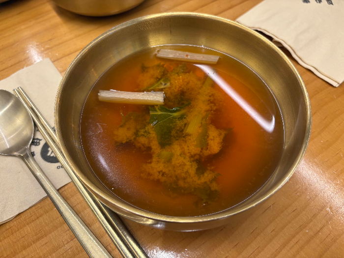A light and mild doenjang soup came with the set, complementing the rice and namul perfectly.