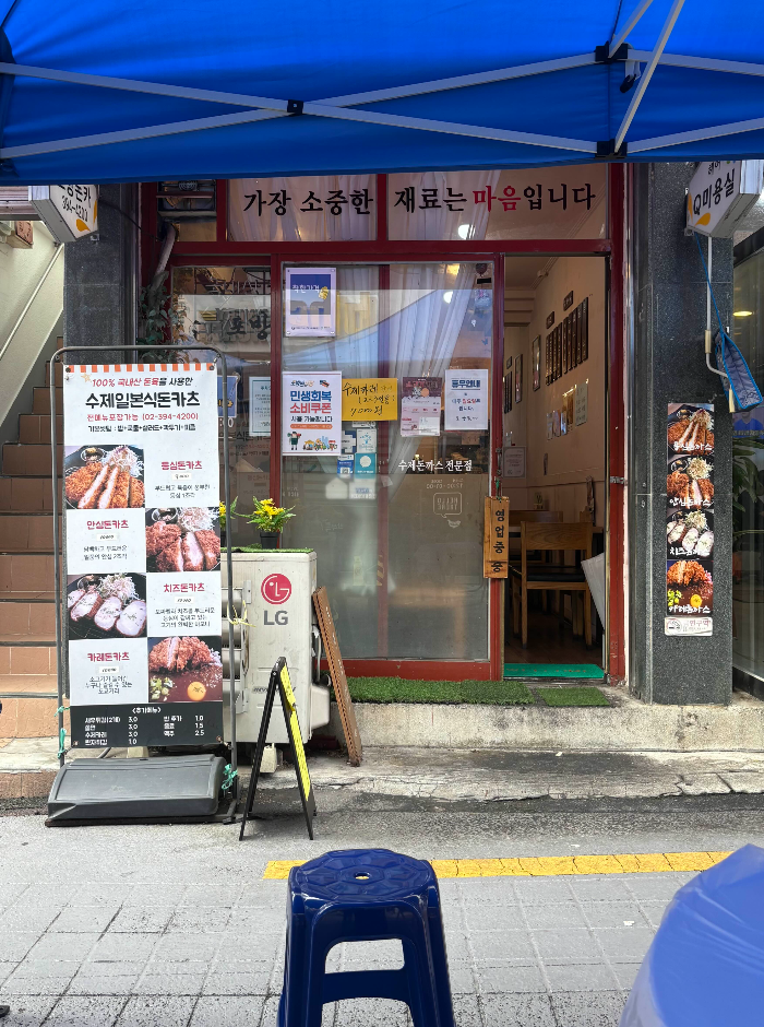 On a weekend, we went for a stroll along the Hongje Stream and decided to check out Pobangteo Market. While wandering through the market, we spotted Pobangdonka, a tonkatsu spot that we often order for delivery. It had been a while since we ate there in person, so we decided to have lunch there.