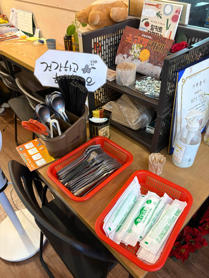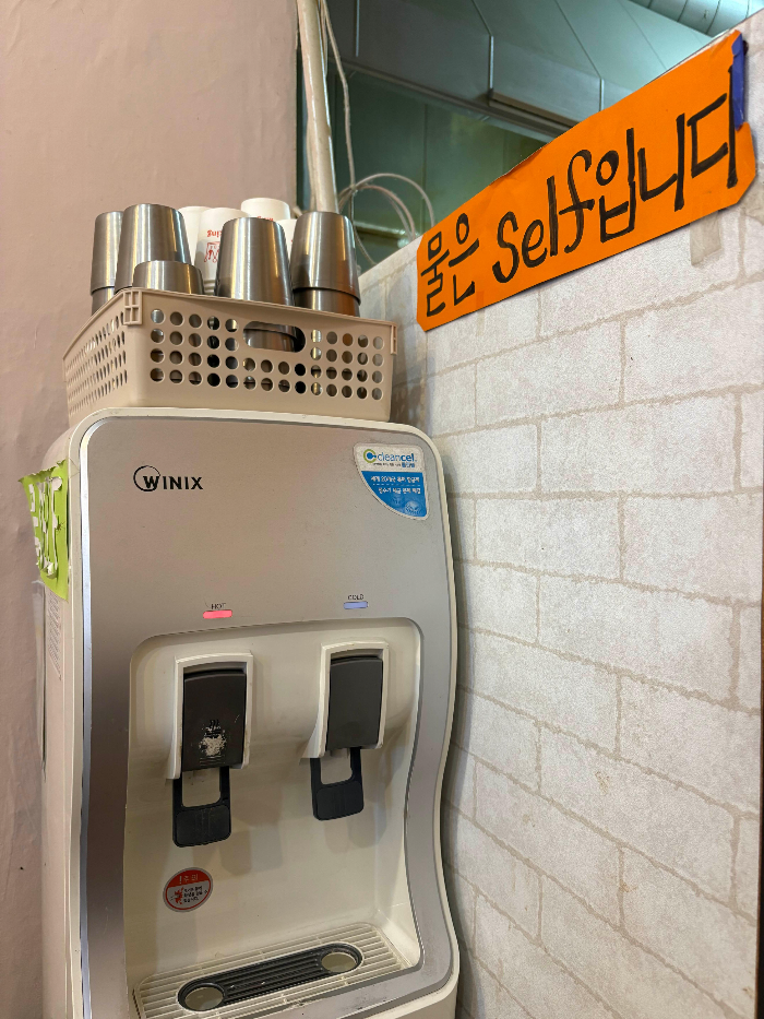 물과 수저, 물티슈는 셀프 서비스로, 한쪽에 마련된 공간에서 직접 가져다 사용할 수 있었어요.