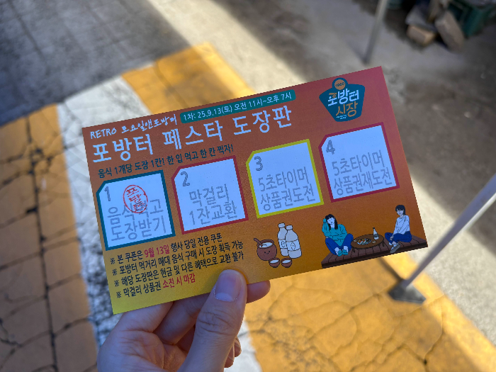 마침 포방터 페스타 행사가 열리던 날이라 시장 안이 꽤 활기찼어요. 야외에서도 식사할 수 있도록 천막이 쭉 설치되어 있었고, 스탬프 투어도 진행 중이라 구경하는 재미가 있었어요.