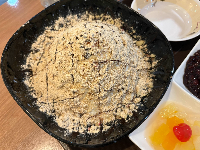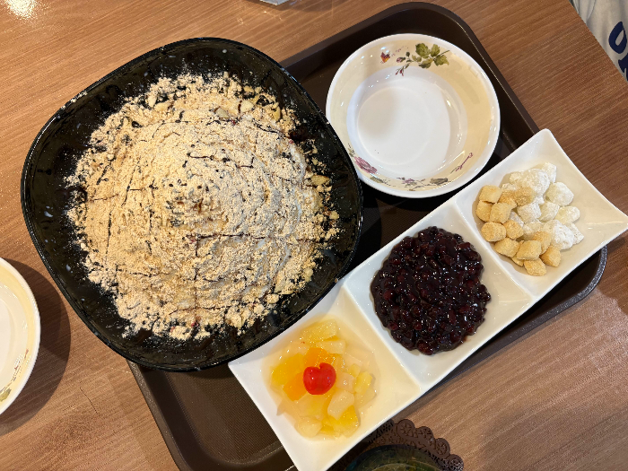 Since my child wanted something sweet, we ordered the snowflake bingsu. It came with plenty of injeolmi (sweet rice cakes) on milk shaved ice, and red beans, fruit, and extra rice cakes were served on the side, so we could enjoy it exactly the way we liked. The combination of sweet red beans and nutty injeolmi was delicious, and both my child and I really enjoyed it.