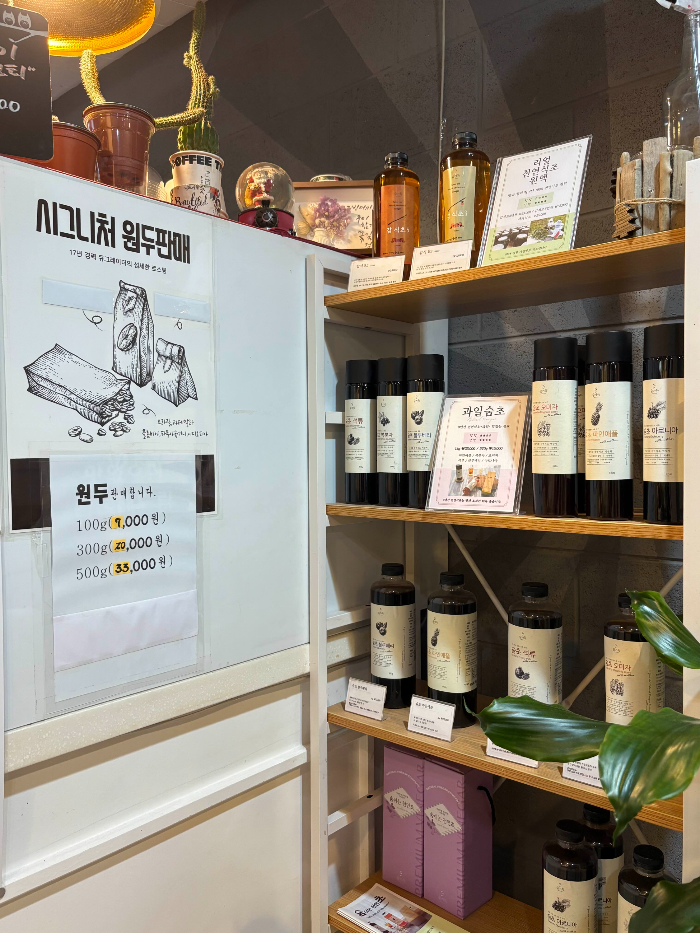 The café also sells a variety of goodies like coffee beans, fruit vinegar drinks, and puffed corn snacks, making it fun to browse around.