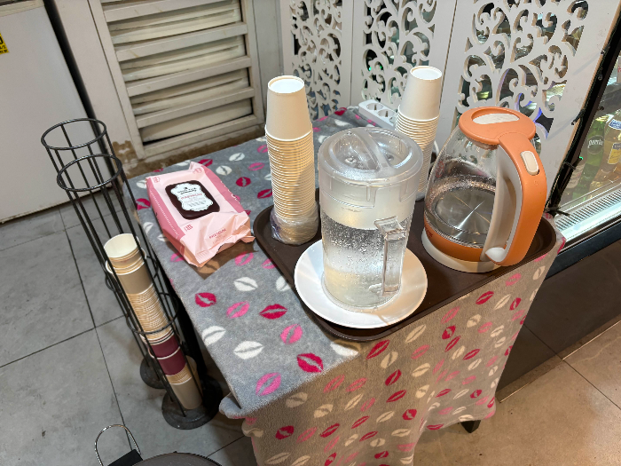 The self-service area is equipped with cups, wet wipes, bottled water, and an electric kettle for hot water, which was very convenient.