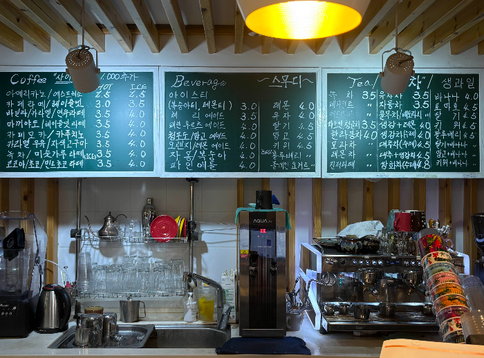 The cafe offers a wide variety of drinks, including coffee, smoothies, teas, and traditional Korean beverages. An Americano costs only 2,500 KRW, making it affordable and perfect for a casual visit.
