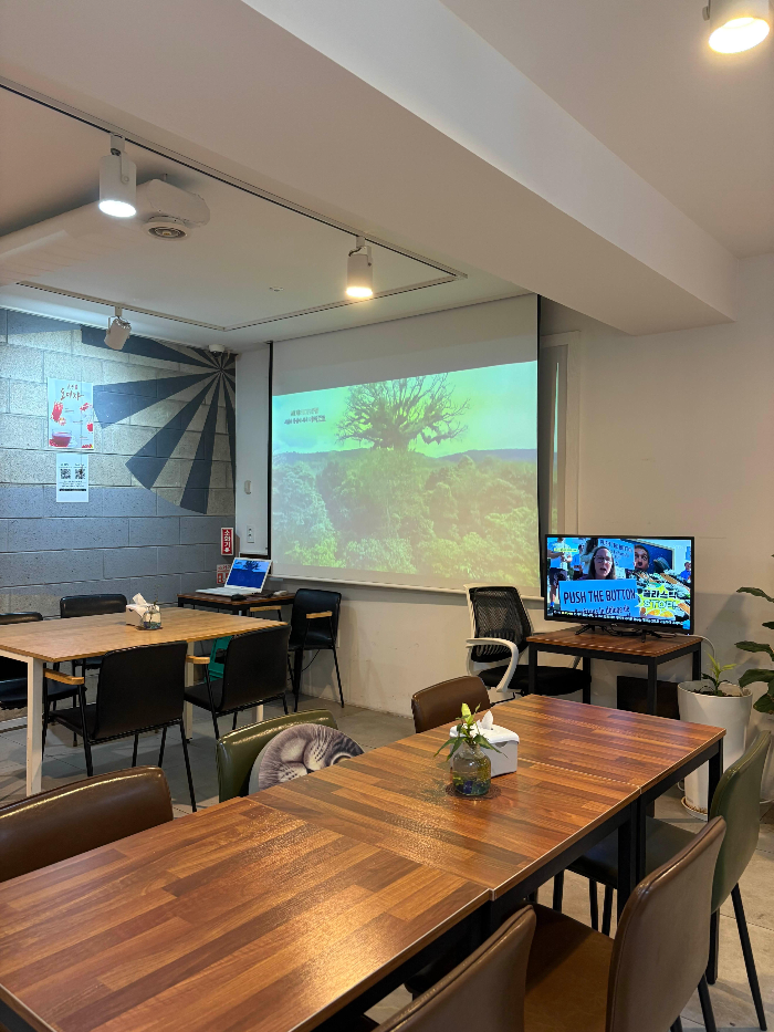 Inside, the cafe is spacious, and one side even has a screen, giving the impression that it could host small gatherings or community meetings.